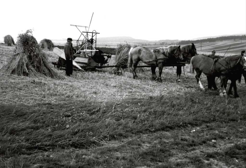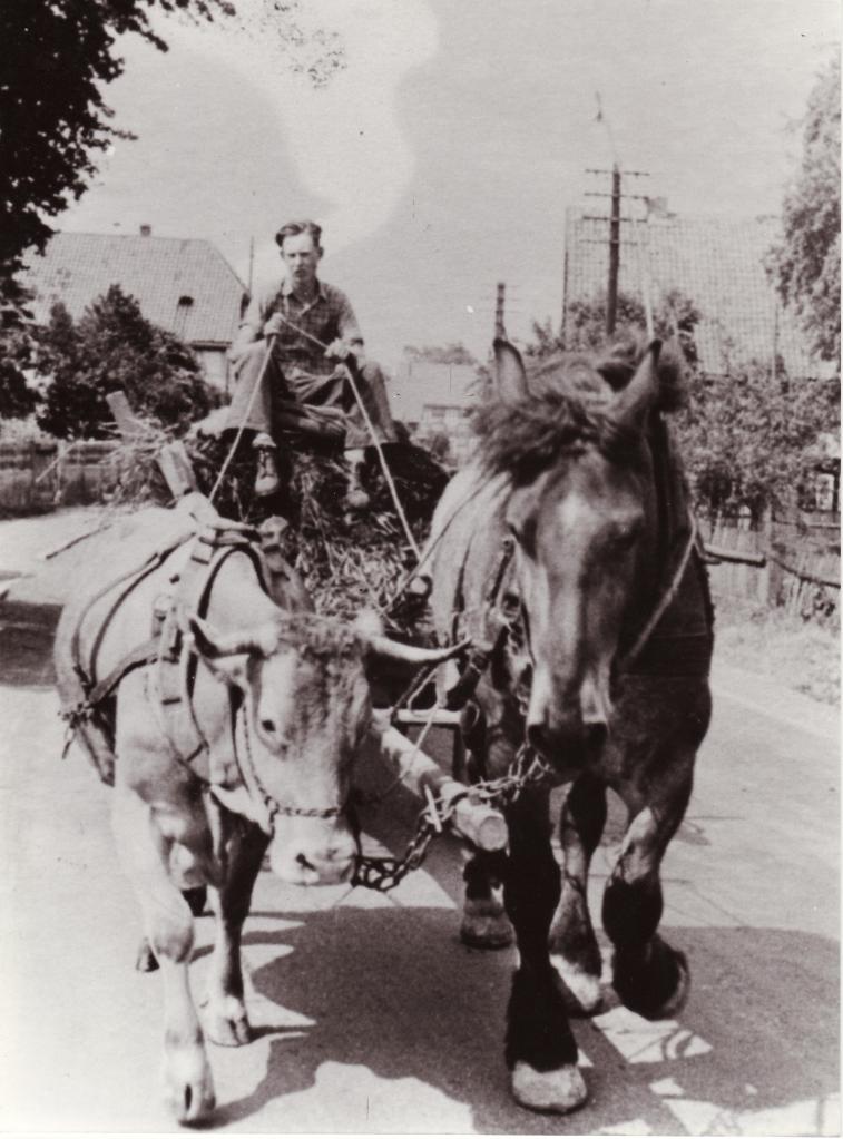 Straßeneinmündung Mittelstr./Angerstr./Gasthaus Fricke: Gustav Ahlborn „Lechtenhäger“ vom Acker kommend auf der Fahrt nach Hause??