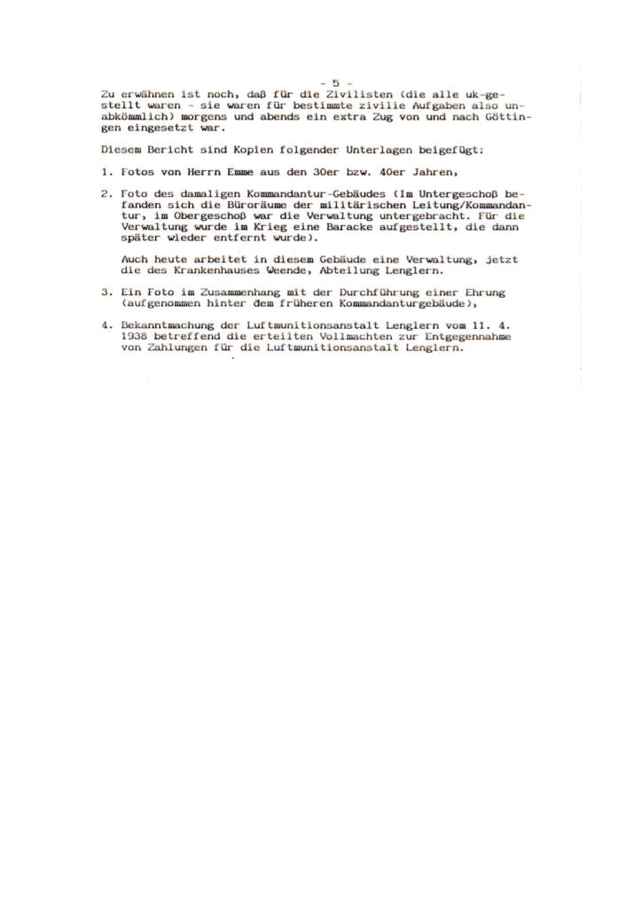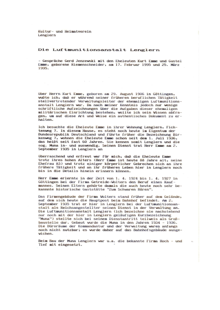 Über Herrn Kurt Emme, geboren am 29. August 1906 in Göttingen, wusste ich, dass er während seiner früheren beruflichen Tätigkeit stellvertretender Verwaltungsleiter der ehemaligen Luftmunitionsanstalt Lenglern war. Da nach meiner Kenntnis jedoch nur wenige schriftliche Aufzeichnungen über die Aufgaben dieser ehemaligen militärischen Einrichtung bestehen, wollte ich sein Wissen abfragen, um auf diese Art und Weise ein authentisches Dokument zu erhalten.