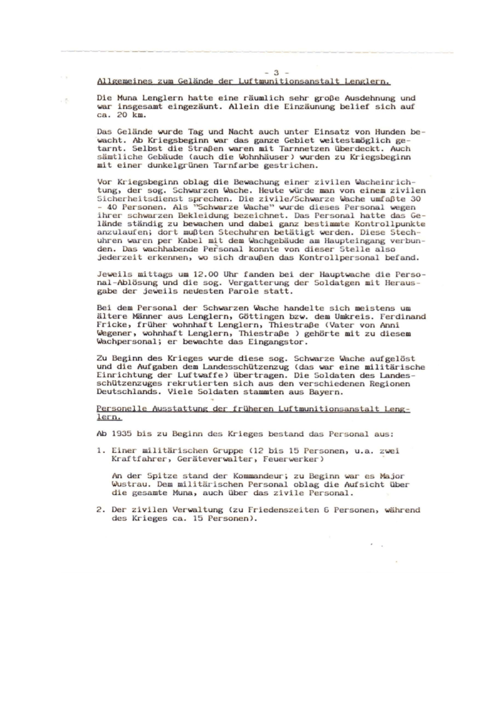 Die Muna Lenglern war als militärische Einrichtung von Anfang an und insbesondere aus Sicherheitsgründen ein streng abgegrenzter Bereich. Das erkennt man u. a. auch am Kopfbogen dieser Anstalt. Herr Emme übergab mir zum Lesen zwei Zeugnisse vom 11. Mai 1943 und 20. April 1944, aus denen diese strenge Abgrenzung deutlich hervorgeht.