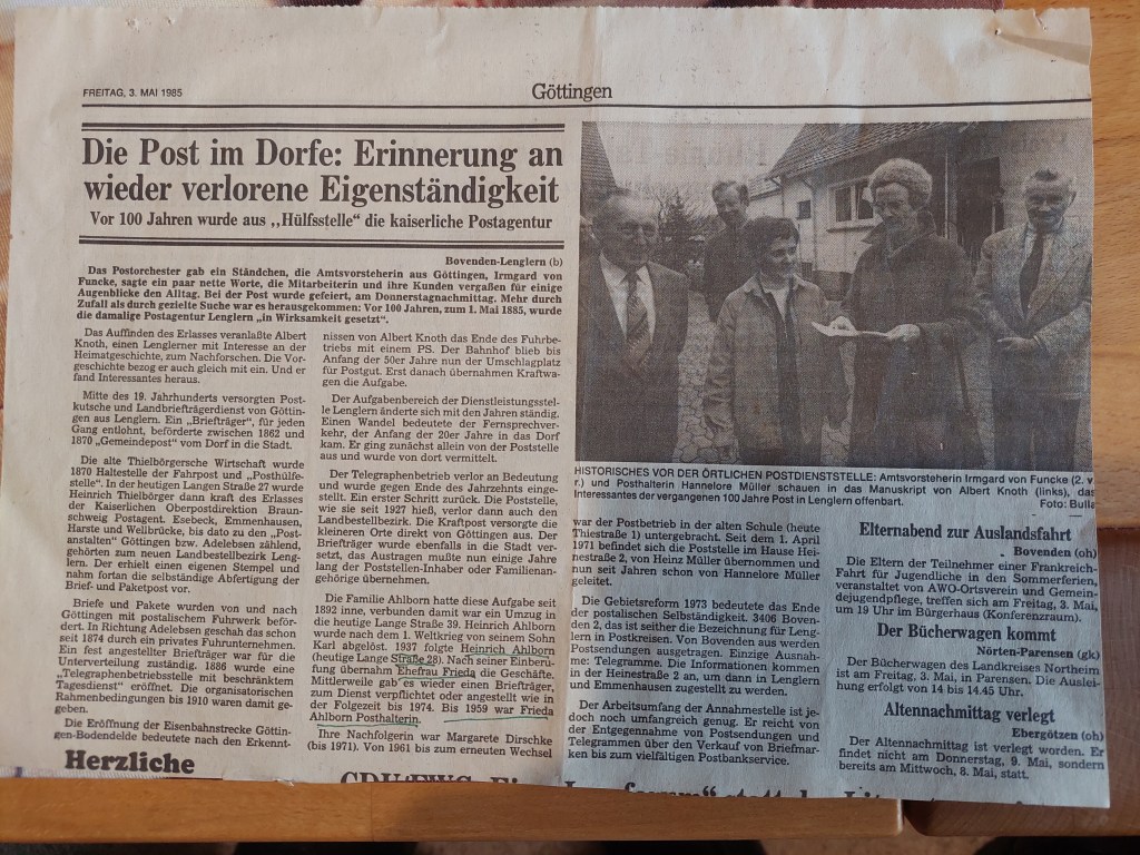 Das Postwesen in Lenglern in früherer Zeit, Göttinger Tageblatt 2. 5. 1965
