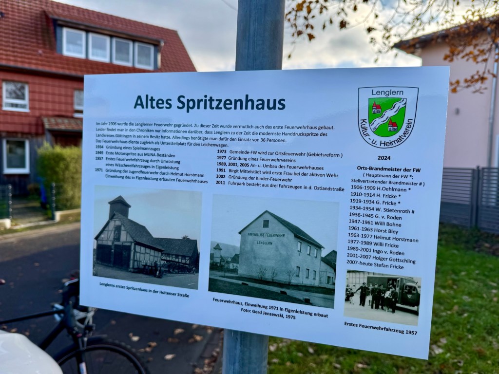 Am 23.11.2024 haben wir neue Informationsschilder in Lenglern angebracht. An der Ecke Hakenborner Weg – Duderstädter Weg informieren wir über die Geschichte des ehemaligen Spritzenhauses der Freiwilligen Feuerwehr, dass einst an dieser Stelle gestanden hat.